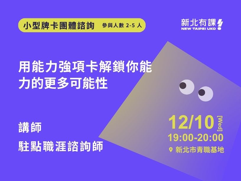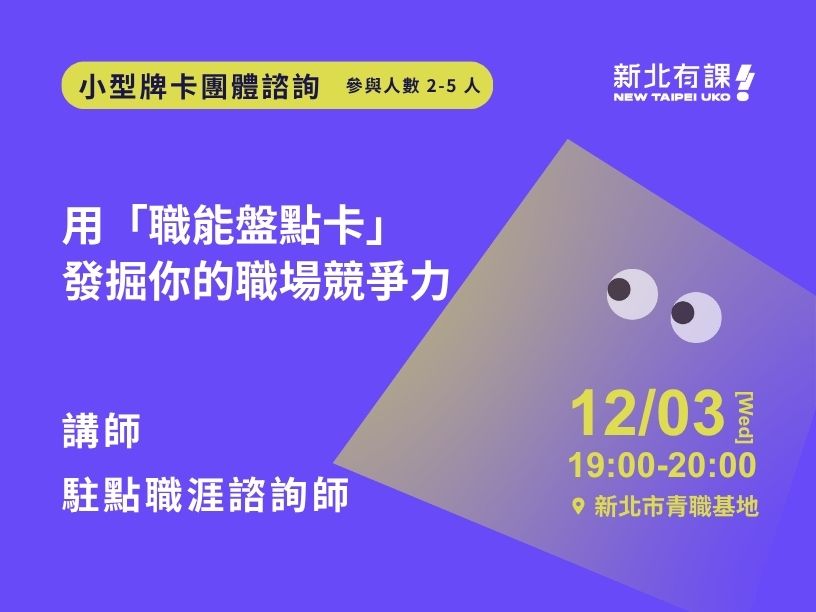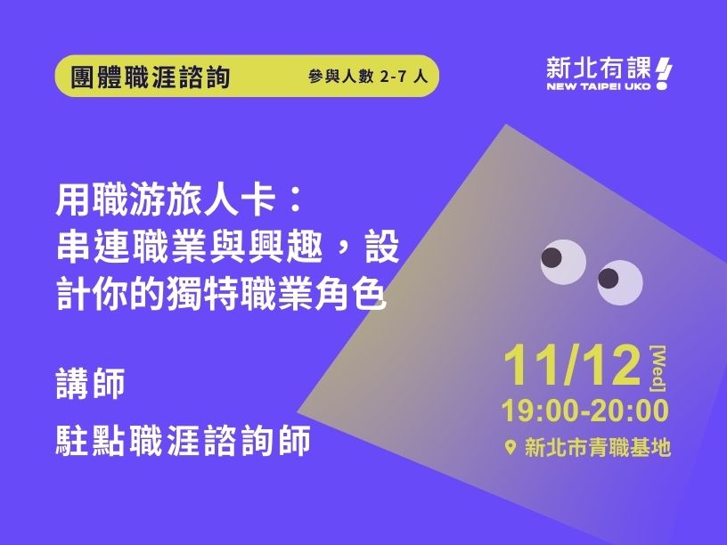 當你對未來感到迷惘,不知道下一步該往哪裡走時,《職游旅人卡》就是一個幫你打開新視野的活動。現場準備了100張不同職業的卡牌,任你憑直覺挑選,完全不用考慮現實條件或能力限制,只看哪一張最吸引你。每張卡牌上都標有RIASEC興趣代碼,讓你一步步拼出屬於自己的職業興趣組合,還能從解說卡中發現更多自己的可能性。本活動設計為2–5人小組,結合互動討論、引導提問及牌卡操作。不論你是想換跑道、剛開始思考未來,還是單純想認識自己,都歡迎來體驗看看,說不定會有全新的發現!