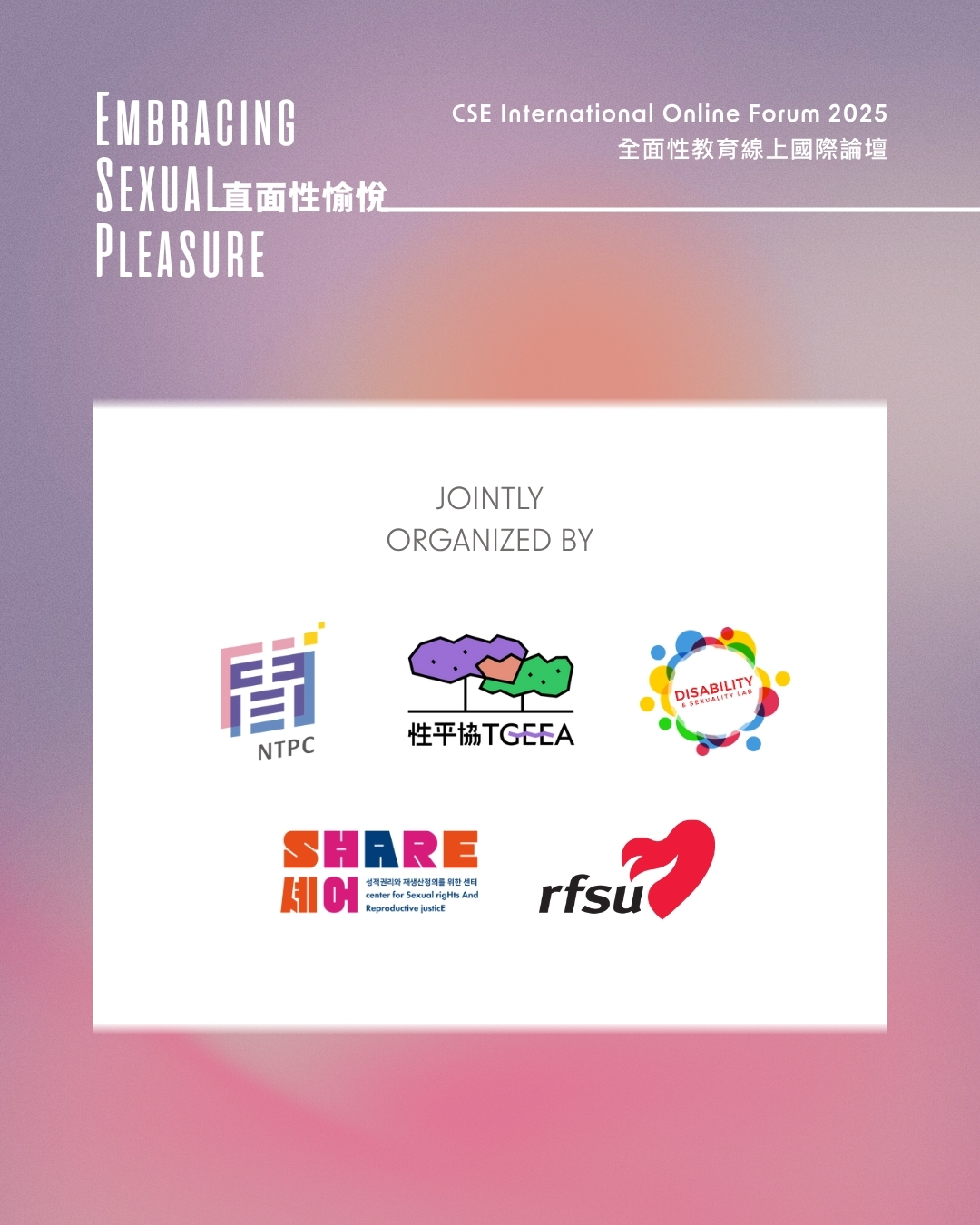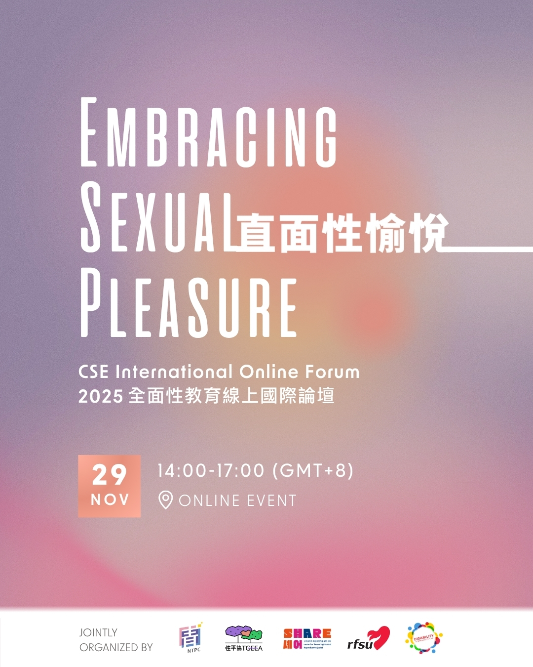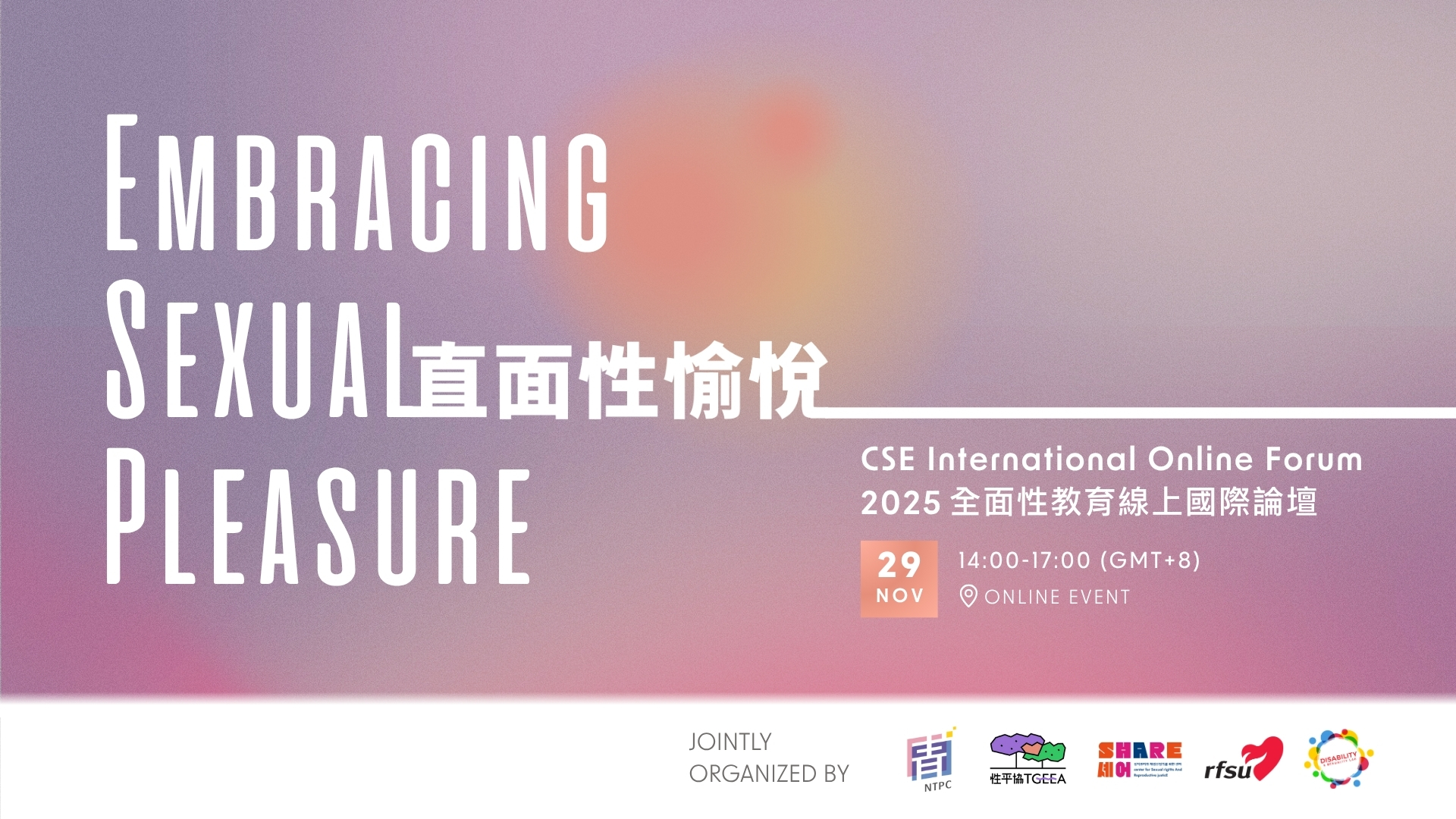 The Taiwan Gender Equity Education Association (TGEEA) will host the “Embracing Sexual Pleasure: CSE International Online Forum 2025” on November 29, 2025. Speakers from Taiwan, Sweden, South Korea, and Canada will explore how, from the perspectives of youth, gender-diverse communities, and people with disabilities, sexuality education can be reimagined and practiced to fully embrace pleasure as a vital part of CSE.