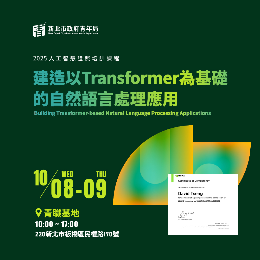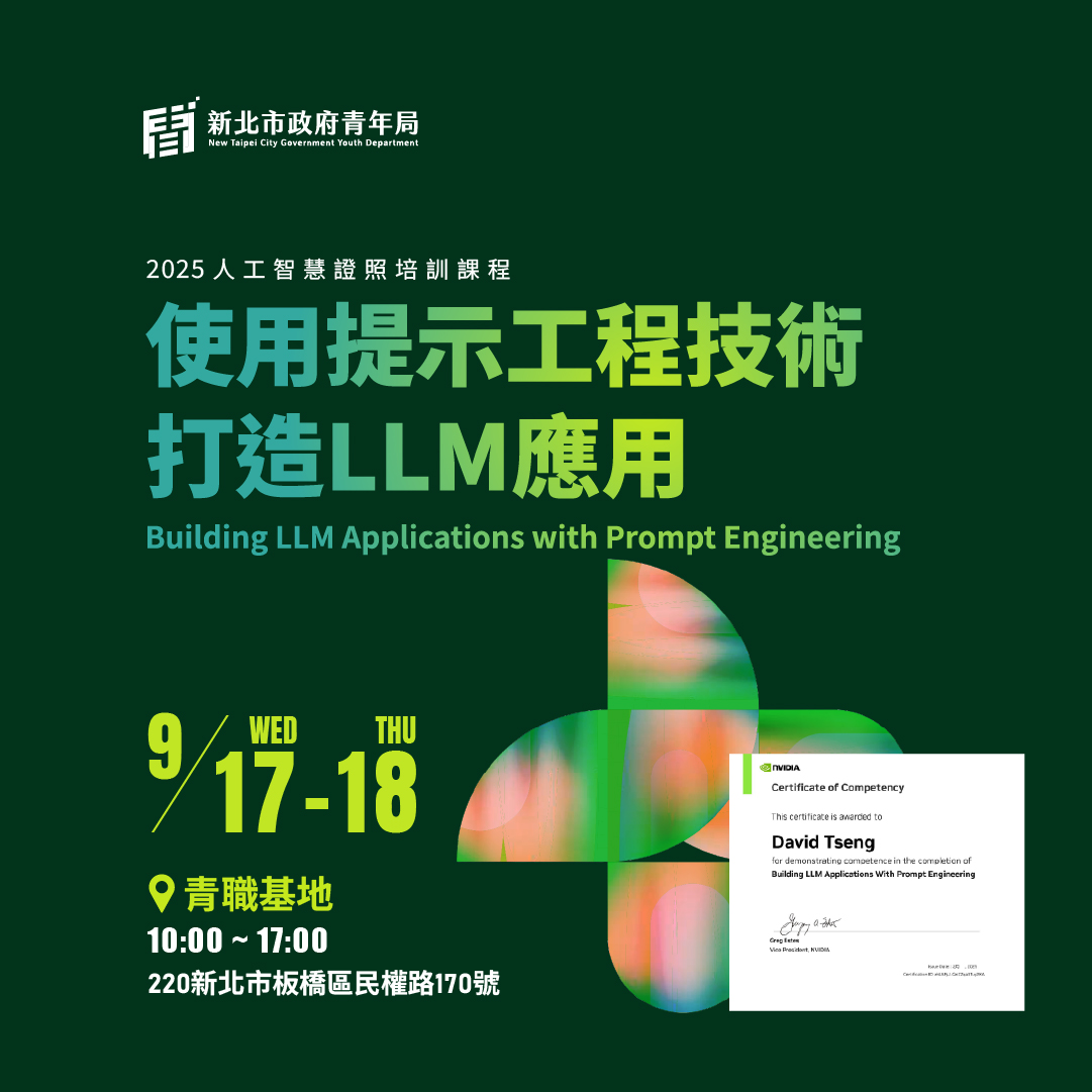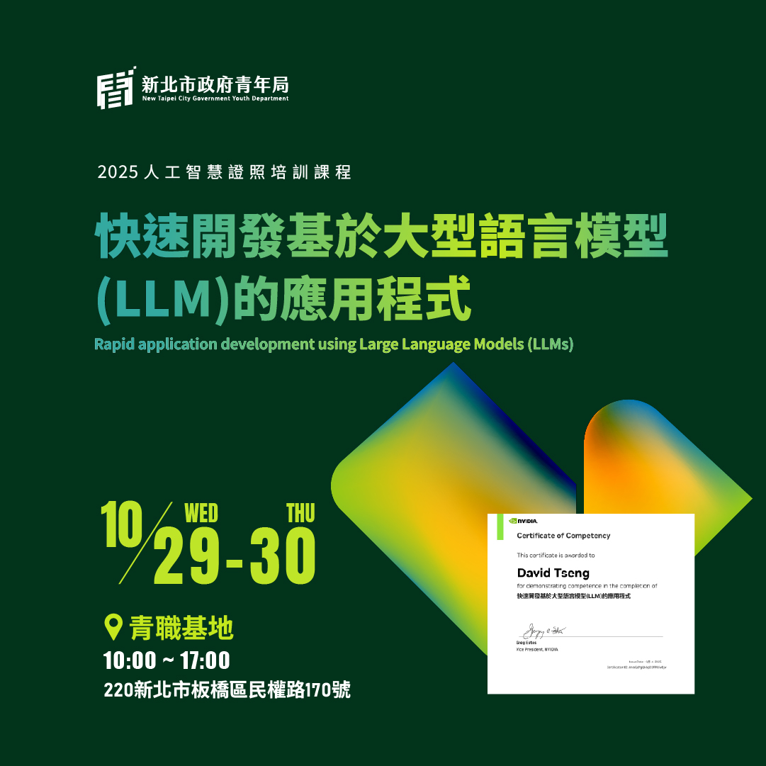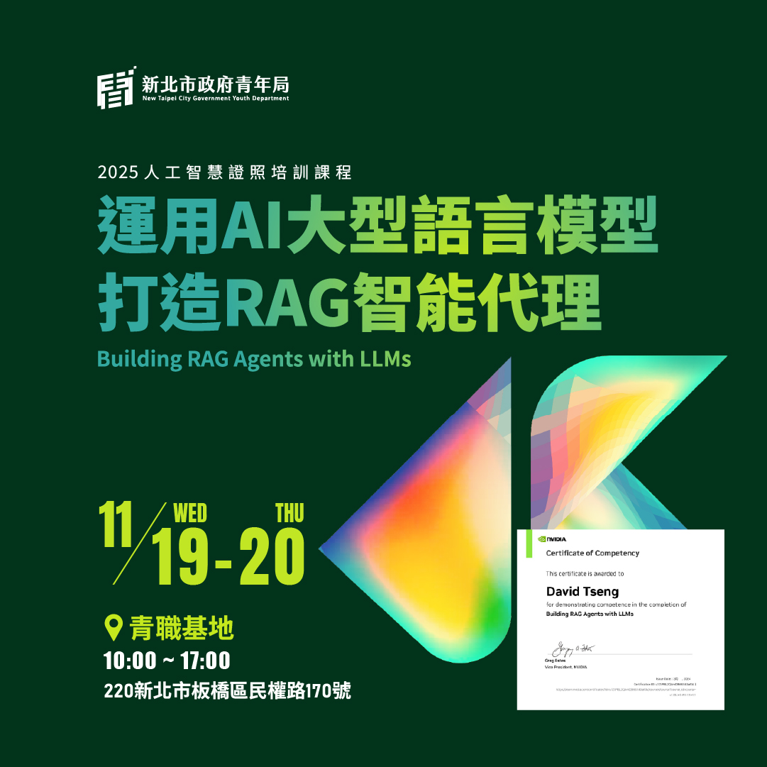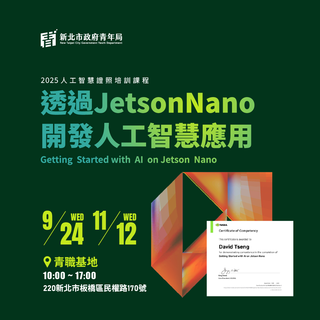 #新北青年 #NVIDIA證照 #NVIDIA #輝達 #AI技能進化 #生成式AI #LLM #RAG #JetsonNano #深度學習 #Python入門 #DLI認證 #新北青年局