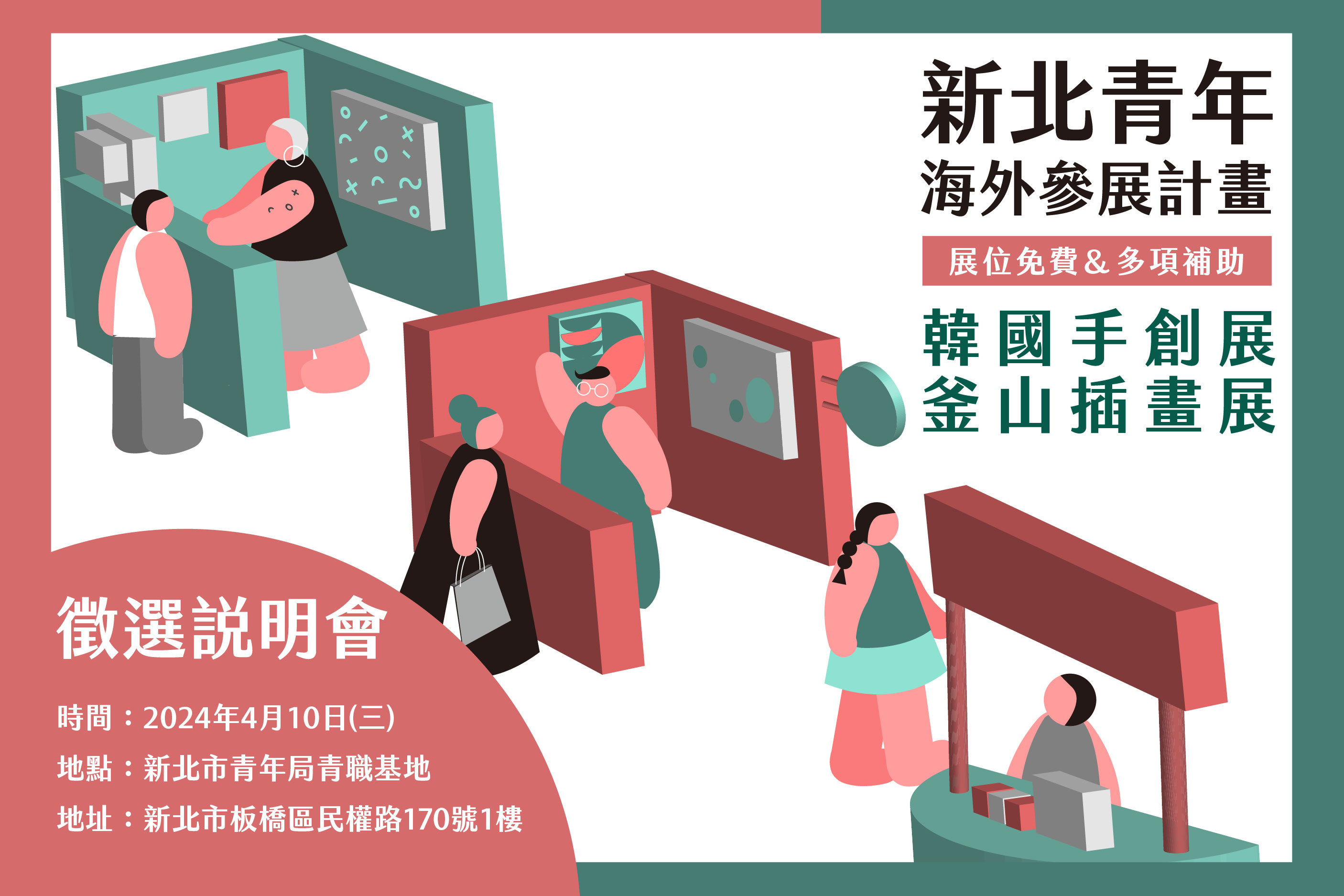 【新北市訊】臺灣文創產業蓬勃興盛,每逢週末各種主題風格市集如百花齊放,不僅全民瘋買文創商品,許多青年也投身藝文手創事業,以插畫、手藝創作開啟斜槓人生。為協助本土創作者拓展國際市場,新北市政府青年局推出首屆「新北青年海外參展計畫」,將帶領 8 組創作者飛往韓國,參加 8 月的「韓國手創展 Handarty Korea」及 11 月的「釜山插畫展 Busan Illustration Fair」。本計畫即將於 4 月 10 日在新北市青職基地舉辦的徵選說明會,歡迎新北青年朋友報名。