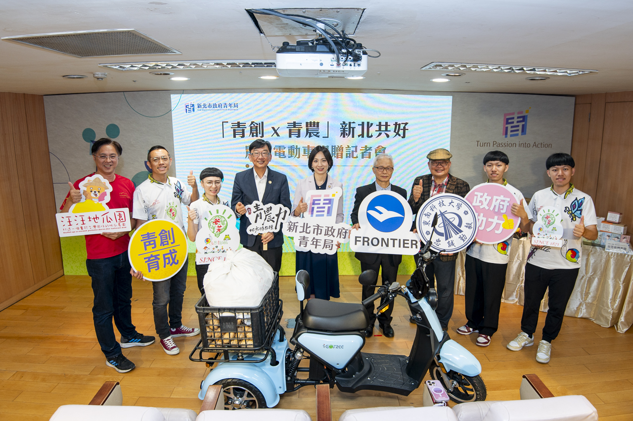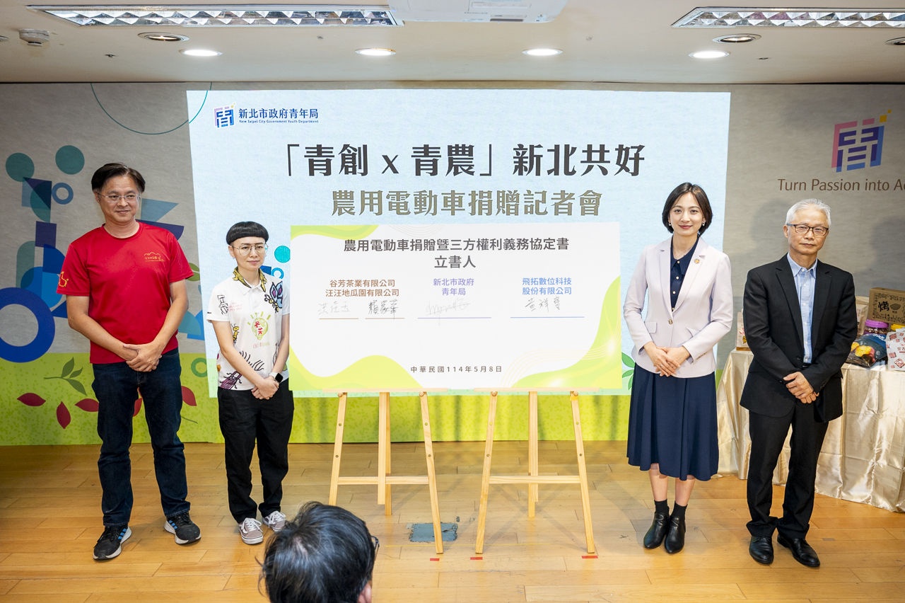 【新北市訊】新北市政府青年局今(8)日舉辦「青創 x 青農」新北共好:農用電動車捐贈記者會,宣布成功媒合飛拓數位科技股份有限公司與新北在地青農「谷芳有機茶園」、「汪汪地瓜園」,導入創新農用電動車,展開一年實地驗證,推動農業綠色轉型與科技智慧應用,打造農業創新新典範。