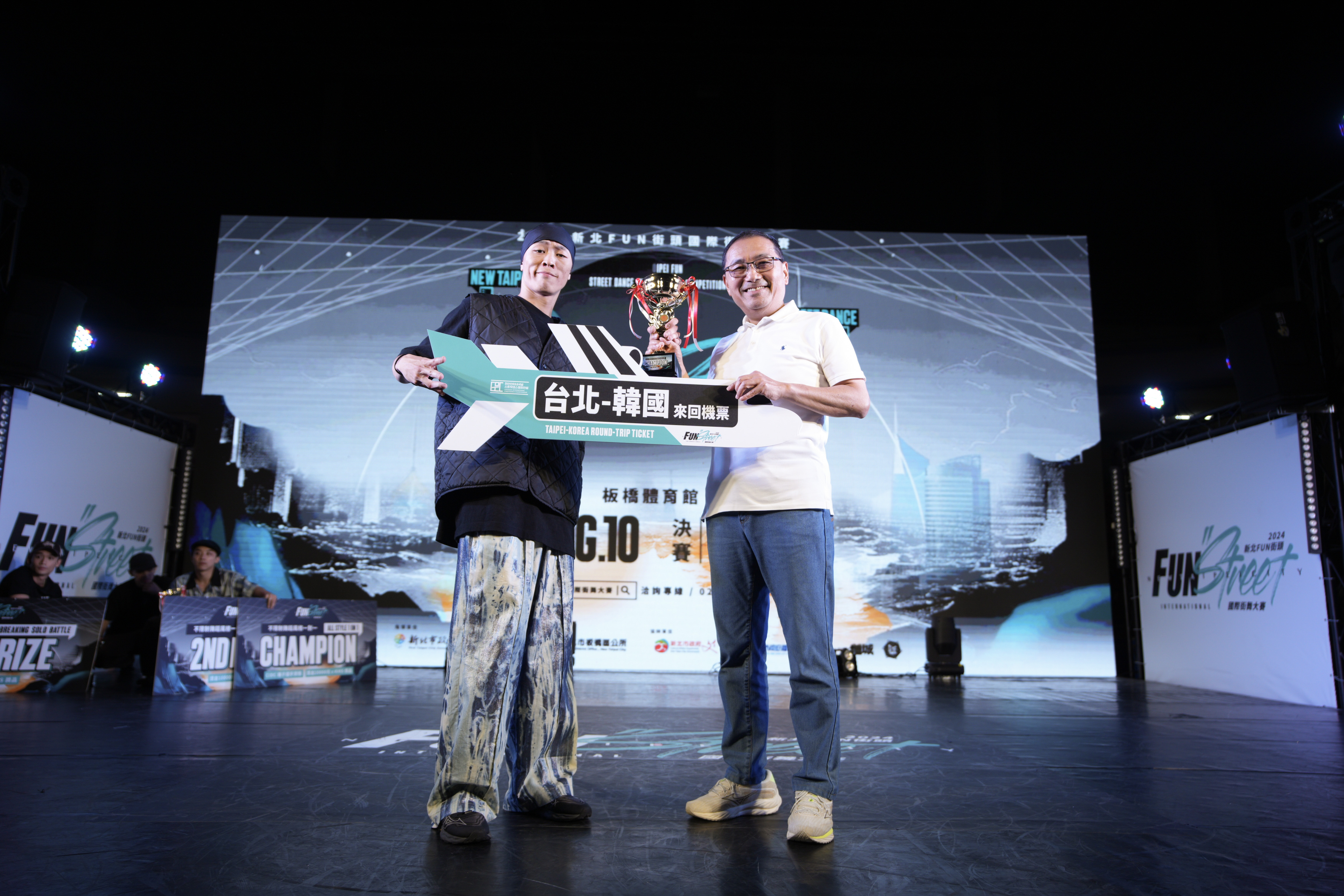 新北市長侯友宜在決賽時刻到場頒獎,並表示新北市政府舉辦街舞大賽已進入第16年,這個舞台孕育出不少台灣頂尖舞者。今年「2024新北FUN街頭國際街舞大賽」首次升級至國際賽事等級,除提高各項獎金、新增入圍獎金外,為因應越來越炎熱的夏日,提供更好的比賽環境,也移至室內場館舉辦。