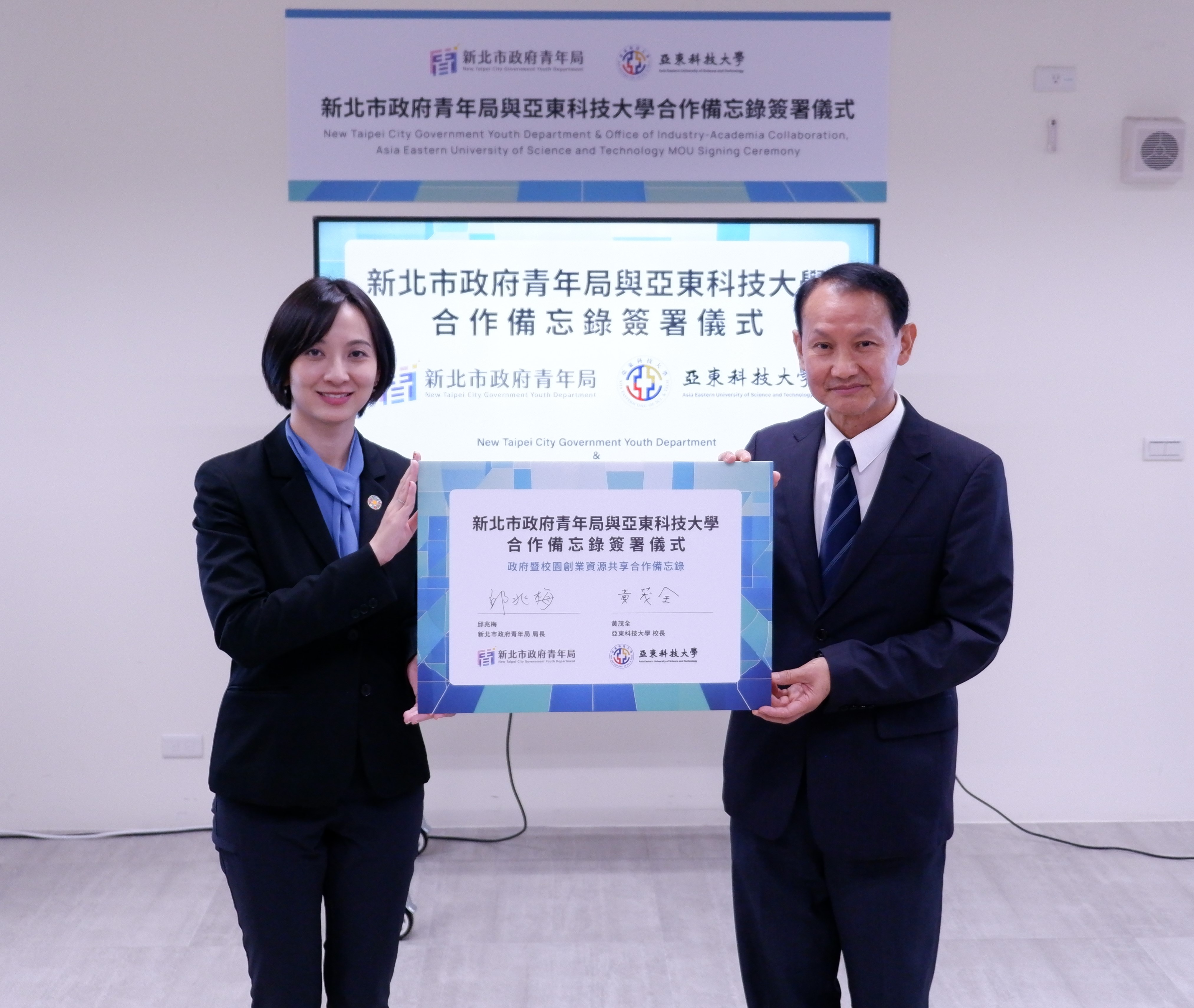 【新北市訊】新北市政府青年局於今(19)日與亞東學校財團法人亞東科技大學於該校淡水校區舉行「創業資源共享合作備忘錄(MOU)」簽署儀式,此次合作由新北市青年局長邱兆梅與亞東科技大學校長黃茂全共同簽署,未來將共享場域空間、設備資源及專業人才,強化資源綜效、技術交流及跨域合作,共同支持青年創業發展。